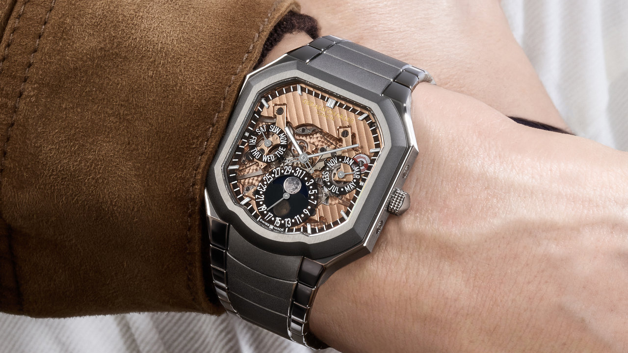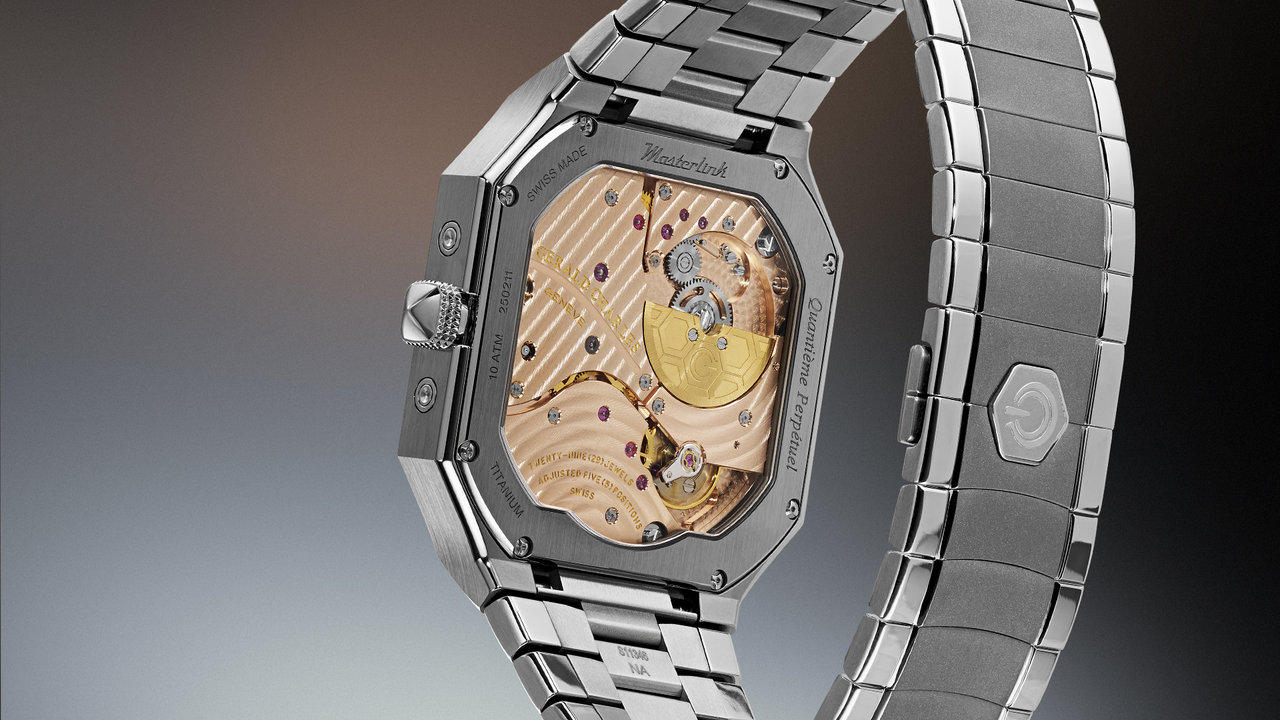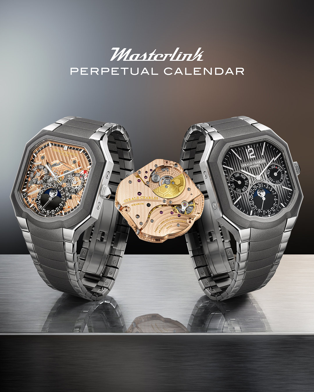 The Masterlink Perpetual Calendar introduces a world-first: an in-house, asymmetrical automatic perpetual calendar calibre with a bespoke three-counter display. Crafted in Grade 5 titanium and powered by the ultra-thin GCA11000 with golden micro-rotor, it delivers day, date, month, leap year and moonphase programmed for over a century, all within a water-resistant architecture rated to 100 metres.