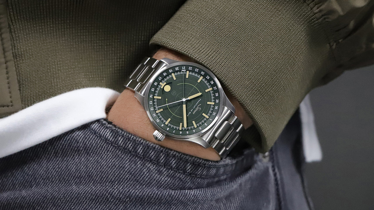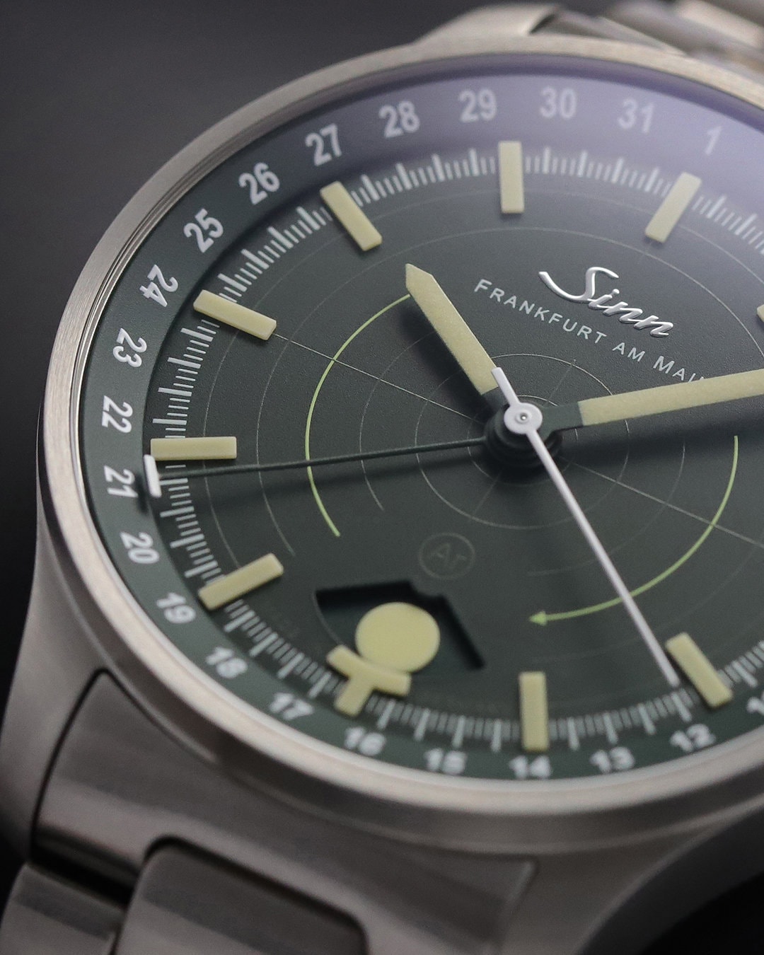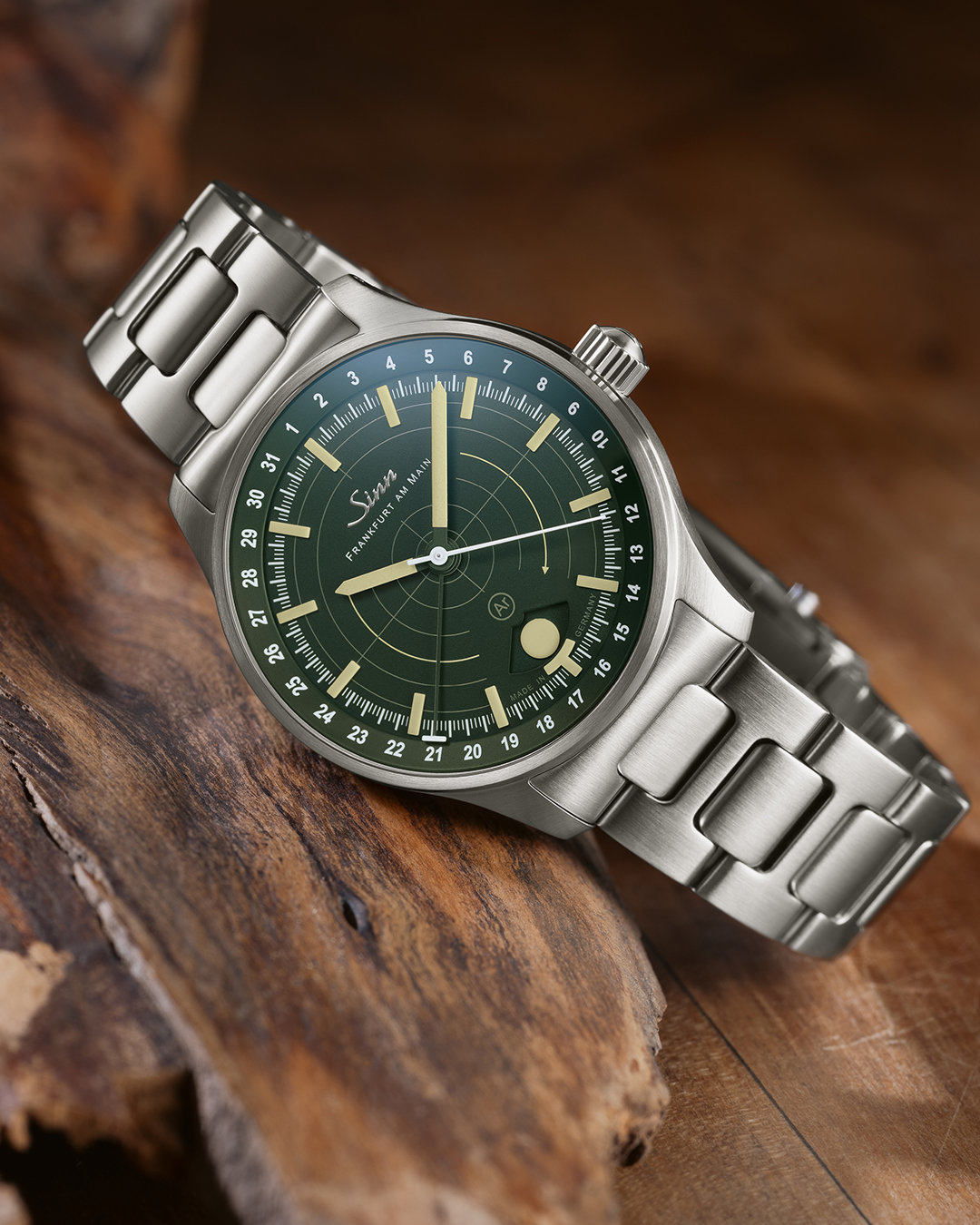 The 308 Hunting Watch combines mechanical precision with features specifically tailored to the demanding lighting and operational conditions encountered in hunting. At its center is the moonlight display positioned at 6 o’clock — a special complication that indicates when natural moonlight reaches sufficient brightness. It provides reliable guidance in situations where artificial light sources must not be used and only the available ambient light is permitted.