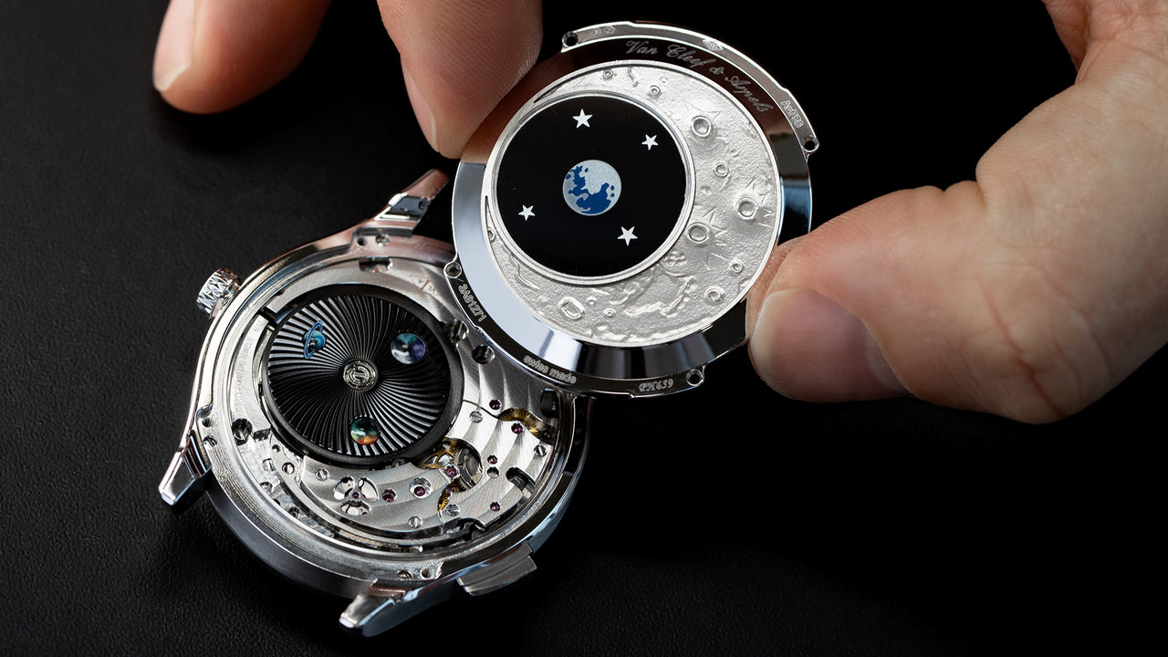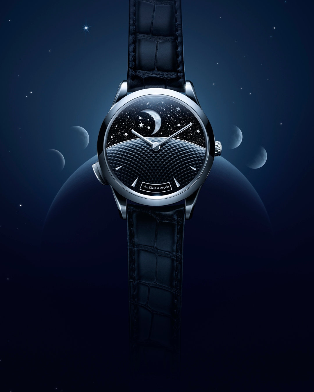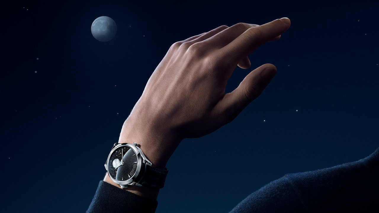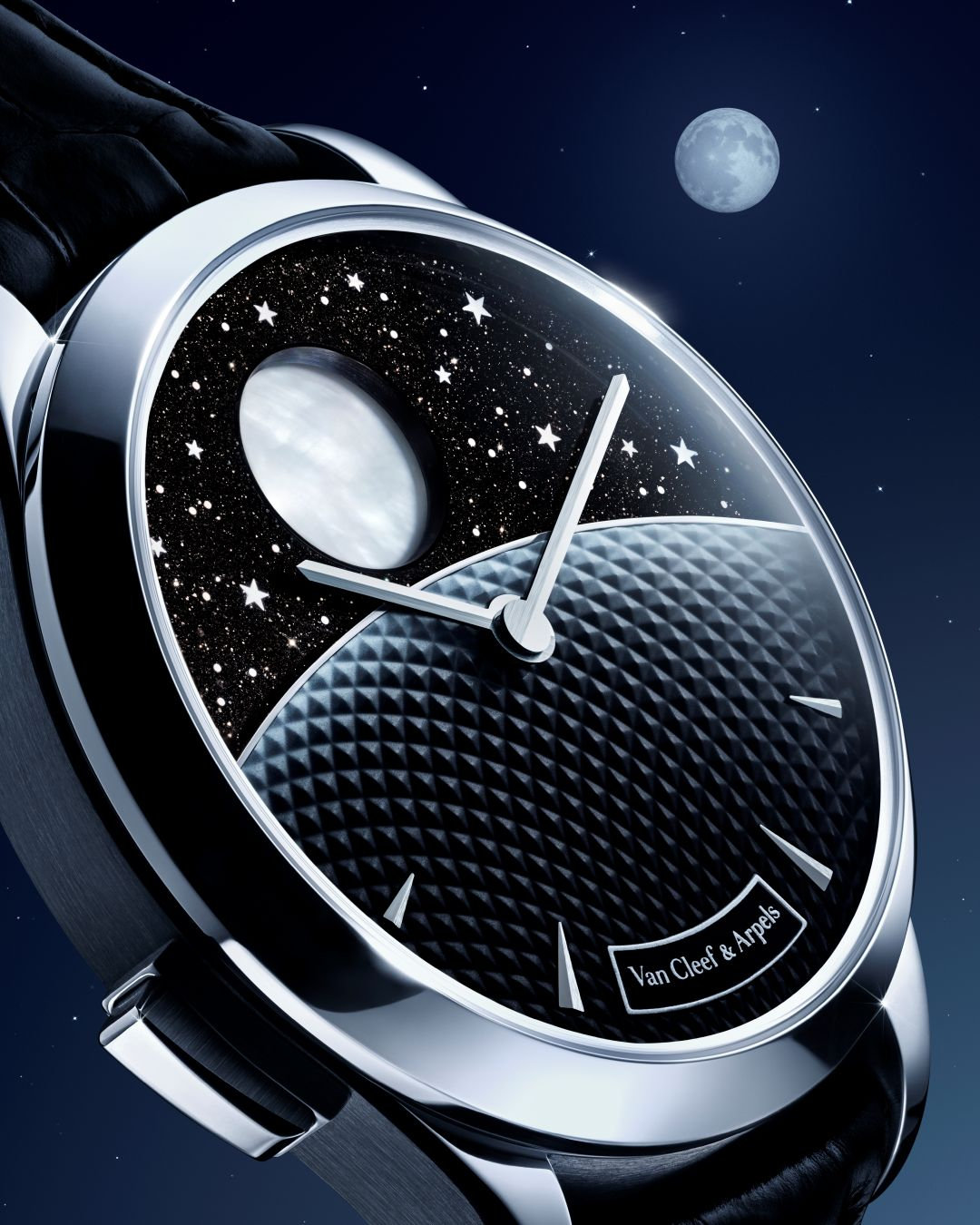 Van Cleef & Arpels is expanding its Jour Nuit collection with a new timepiece in honor of the Moon. Within the Midnight case, the watch features two overlapping complications: the first one animates the Jour/Nuit display, while the second one illustrates the actual Moon phase. The phenomenon remains visible on demand even when the Moon is hidden behind the shroud, thanks to a button.