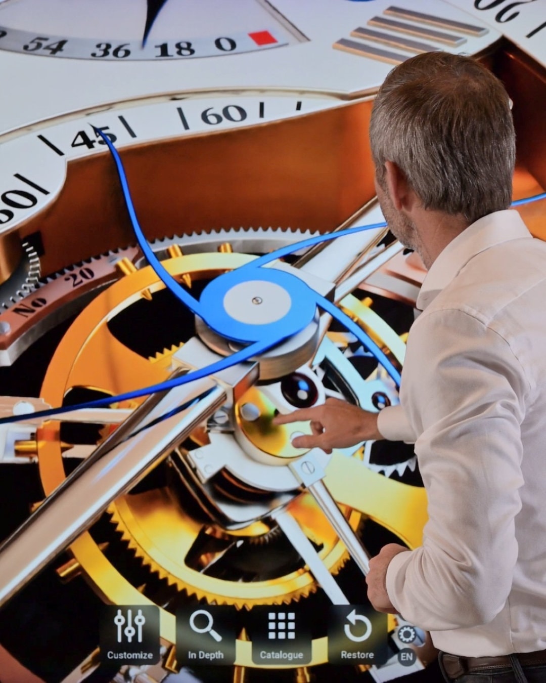 Alliant lumière, mouvement et narration, la vitrine crée un dialogue vivant entre l’objet et le visiteur. L’écran tactile permet d’explorer les détails, de visualiser des animations 3D et d’accéder à des contenus de marque, révélant ce qu’une présentation traditionnelle ne peut montrer. Les visiteurs avancent librement, à leur rythme, et découvrent la complexité, la mécanique et l’émotion qui se cachent derrière chaque pièce.